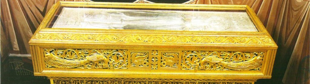 Χρονικά η κοίμηση του οσίου τοποθετείται στο διάστημα μεταξύ των ετών 535 – 541. Εκατόν πενήντα χρόνια μετά την κοίμηση του οσίου (περί 685-690) έγινε προσπάθεια από τον ηγούμενο του μοναστηριού όπου είχε ταφεί ο όσιος, να ανοιχθεί ο τάφος, για να λάβει μέρος του αγίου λειψάνου προς αγιασμό. Μόλις όμως ξεκίνησαν τις εργασίες, η πλάκα που κάλυπτε τον τάφο έσπασε σε πολλά μέρη και αυτό θεωρήθηκε ως φανέρωση του αγίου να μην θιγεί το άγιο λείψανο. Έτσι, παρέμεινε στην αρχική του θέση μέχρι την εποχή των σταυροφοριών.