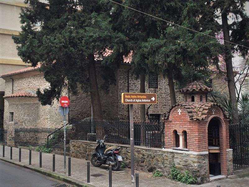 Το ιερό παρεκκλήσιο του αγίου Αντωνίου βρίσκεται στο ανατολικό τμήμα της παλιάς πόλης της Θεσσαλονίκης, στη γωνία των οδών Δ. Μαργαρίτη και Φιλικής Εταιρείας, πολύ κοντά στην πλατεία Ιπποδρομίου, που αποτελούσε, κατά τη διάρκεια της Τουρκοκρατίας τον πυρήνα του Ελληνισμού της πόλης. Ο ναός του αγίου Αντωνίου είναι μεταγενέστερο κτίσμα, χρονολογούμενο στο δεύτερο μισό του 19ου αιώνος μ.Χ. και αποτελεί χαρακτηριστικό παράδειγμα «δίκλιτης» κεραμοσκέπαστης βασιλικής με στοά, που δυστυχώς όμως δε σώζεται σήμερα. Ο μικρός ναός που συνοδευόταν και από μία σειρά κτισμάτων ήταν εξάρτημα του παλιού ναού του αγίου Κωνσταντίνου που υπήρχε στη σημερινή πλατεία Ιπποδρομίου και κατεδαφίστηκε, για να κτισθεί στη θέση του, νέος ναός. Η ανατολική πλευρά του ναού του αγίου Αντωνίου στηριζόταν στα τείχη της περιοχής που κατεδαφίστηκαν λίγο αργότερα. Ακόμη υπάρχουν ενδείξεις πως παράπλευρα υπήρχε στον ίδιο χώρο κάποιο αρχαίο κτίσμα, πιθανότατα παρεκκλήσιο, που χρησιμοποιούνταν ως χώρος λατρείας.
