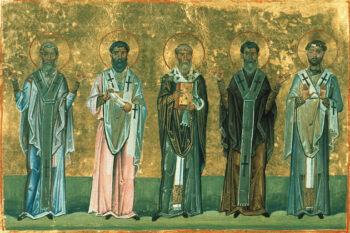 Οι Θεσσαλονικείς Απόστολοι, εκ των Εβδομήκοντα, Ερμάς, Πατρόβας, Λίνος, Γάϊος και Φιλόλογος συνεργάτες του Αποστόλου Παύλου. Μικρογραφία από το «Μηνολόγιο» του Βασιλείου Β’.
