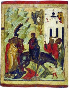8. Ο μεν βασιλεύς λοιπόν που ανέστησε τον Λάζαρο εισήλθε τότε στα Ιεροσόλυμα καθήμενος επάνω σε όνο· αμέσως δε όλοι οι λαοί, παιδιά, άνδρες, γέροντες, στρώνοντας τα ενδύματα και παίρνοντας βαΐα από φοίνικες, που είναι σύμβολα νίκης, τον προϋπαντούσαν σαν ζωοποιό και νικητή του θανάτου, τον προσκυνούσαν, τον προέπεμπαν, ψάλλοντας με μια φωνή όχι μόνο έξω, αλλά και μέσα στον ιερό περίβολο, «ωσαννά στον υιό του Δαβίδ, ωσαννά εν τοις υψίστοις».