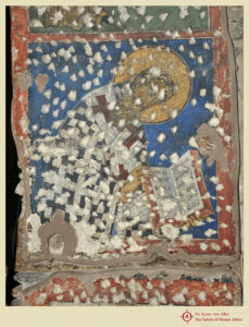Θα αρχίσουμε την έρευνα από την τοιχογραφία που αποκαλύφθηκε το 1982 στο καθολικό της Μ. Βλατάδων5. Στο θυραίο άνοιγμα που οδηγεί από το νάρθηκα στον κυρίως ναό, στο βόρειο μέτωπο του νοτιοδυτικού πεσσού, εικονίζεται η μορφή του ιεράρχη. Φορεί αρχιερατικό ένδυμα και είναι στραμμένος προς τα δυτικά. Κρατεί στα χέρια ανοιχτό κώδικα και είναι έντονα σκυμμένος μπροστά.
